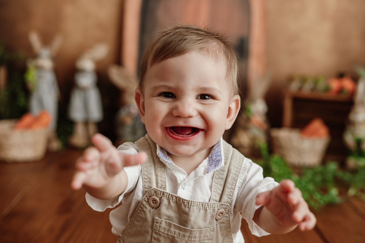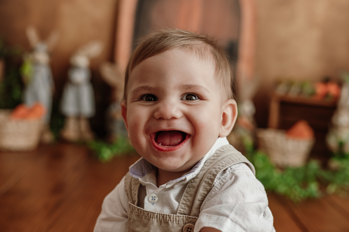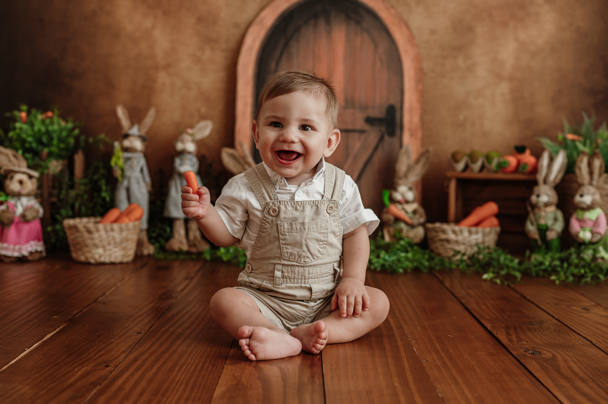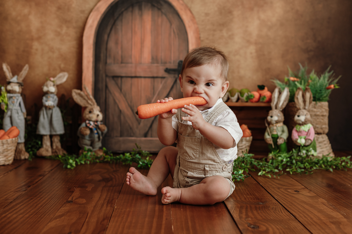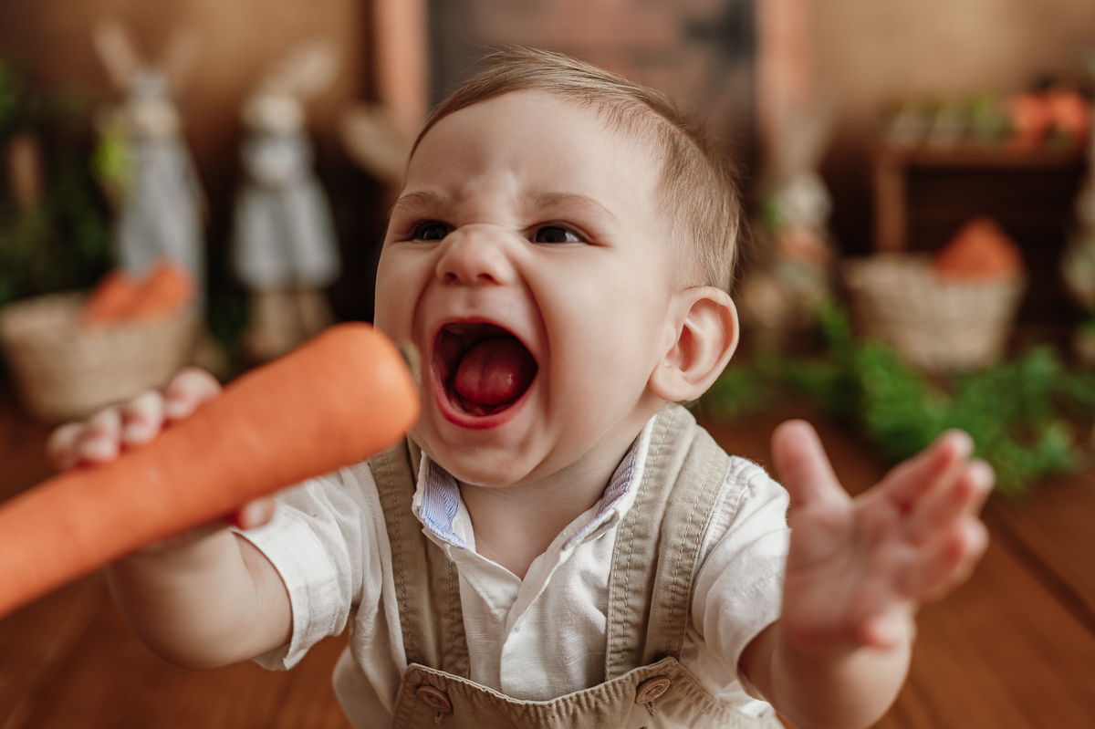 Daqueles bebês que se entregam, que brincam, que olham com curiosidade pra tudo ao redor. Ele riu, explorou, apertou as cenouras, descobriu texturas… e me deu de presente um ensaio inteiro cheio de verdade.